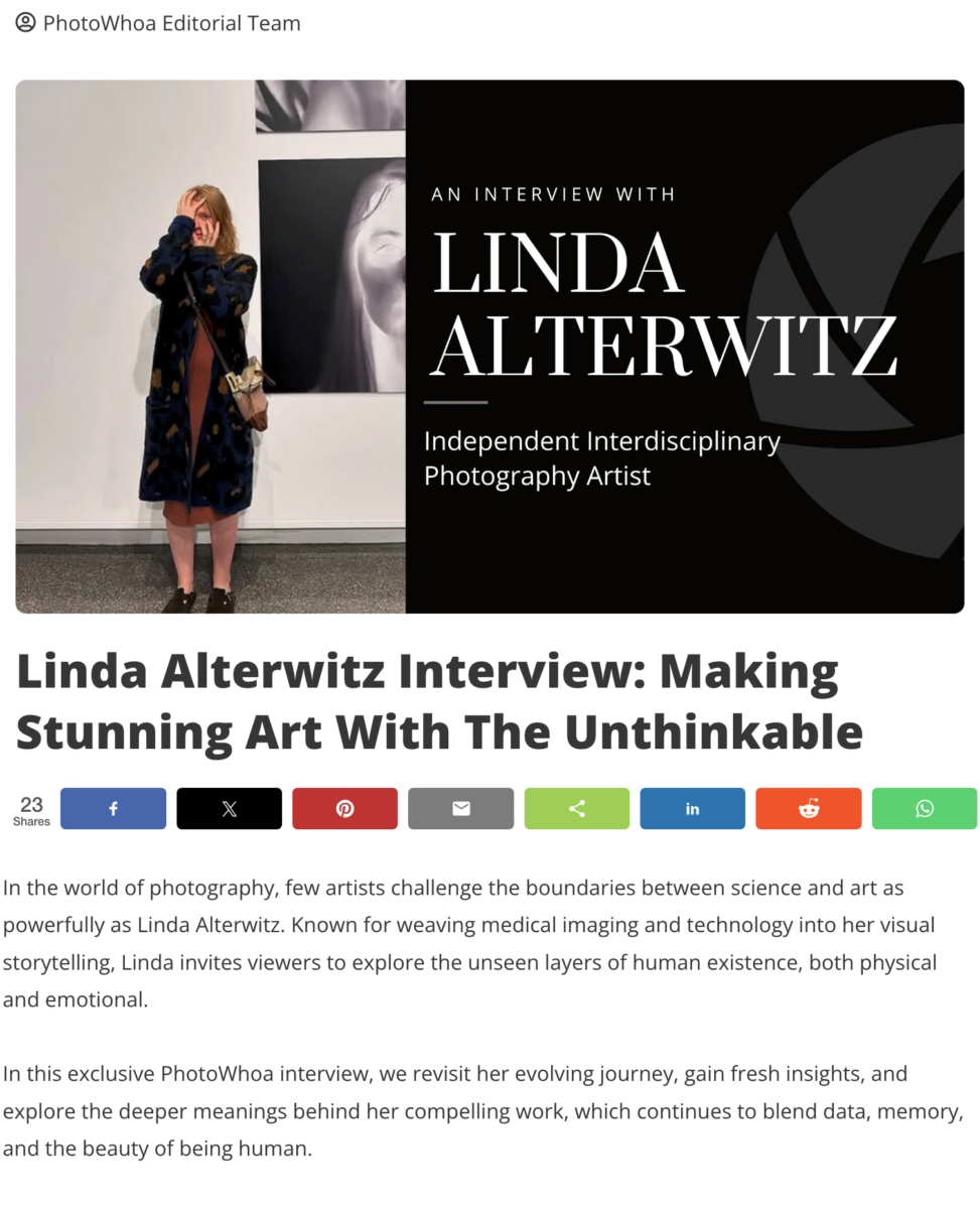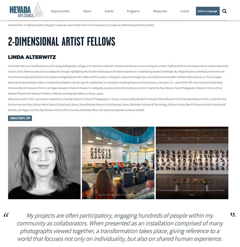 2025, Interview with Linda Alterwitz by Photo Whoa Magazine read more 2025, Visual Art Fellowship, Nevada Arts Council read more 2025, “We Have Been Here Before” FORMAT25, Group Exhibition, International Photography Festival, Derby, UK read more 2025, FORMAT25 Conference, International Photography Festival, Derby, UK read more 2025, “We Have Been Here Before” FORMAT25, Group Exhibition, International Photography Festival, Derby, UK read more 2025, “Injection Site: Making the Vaccine Visible” FORMAT25, International Photography Festival, Derby, UK read more 2025, Nevada Arts Council Visual Art Fellow read more 2024, “Capturing Commonalities: FLIR is the Camera of Choice for this Artist” read more 2024, “What’s at Risk for Public Health” New York Times read more 2024, “Injection Site: Making Vaccines Visible” The Center, Las Vegas, Nevada read more Page 1 Page 2 Page 3 Page 4 … Page 8 Next