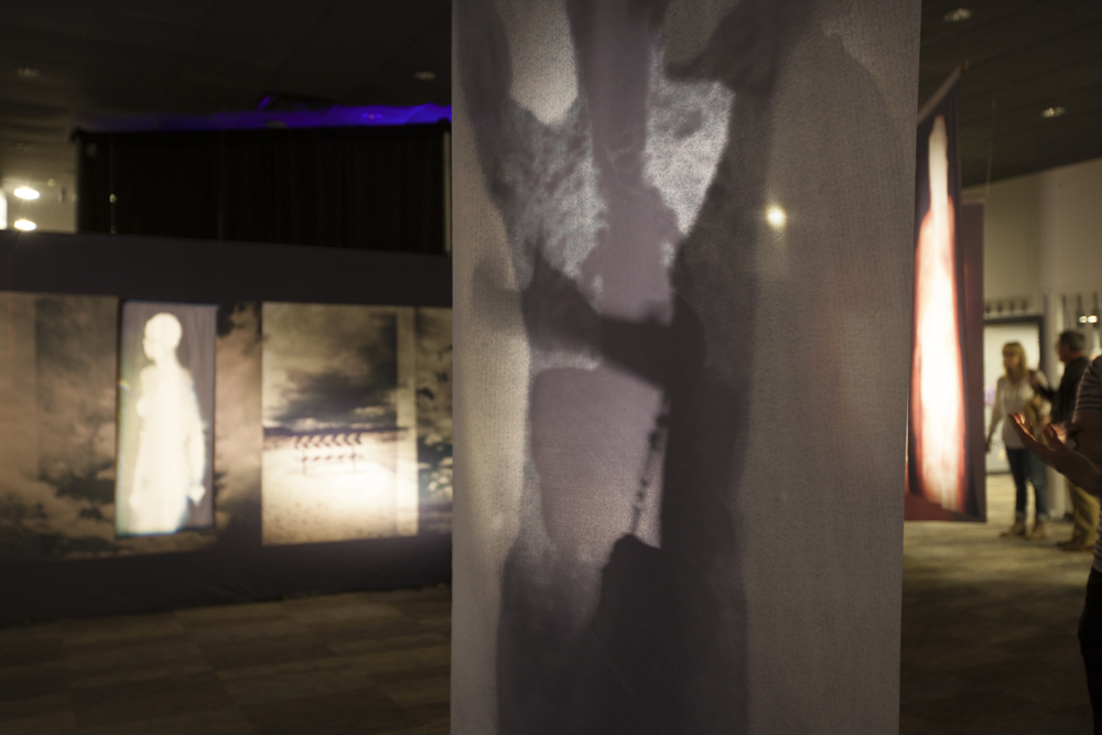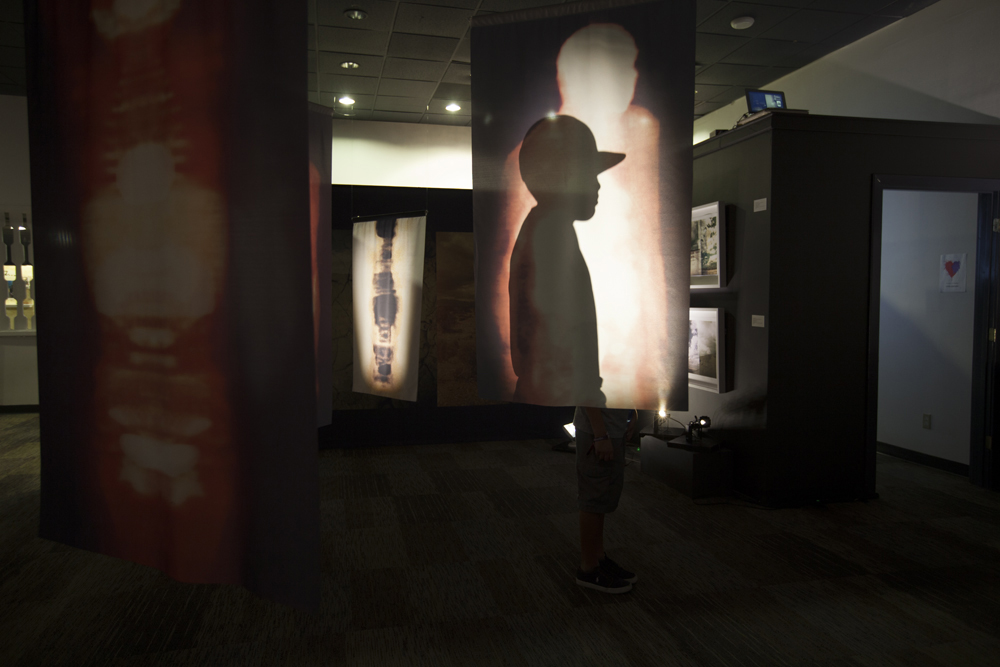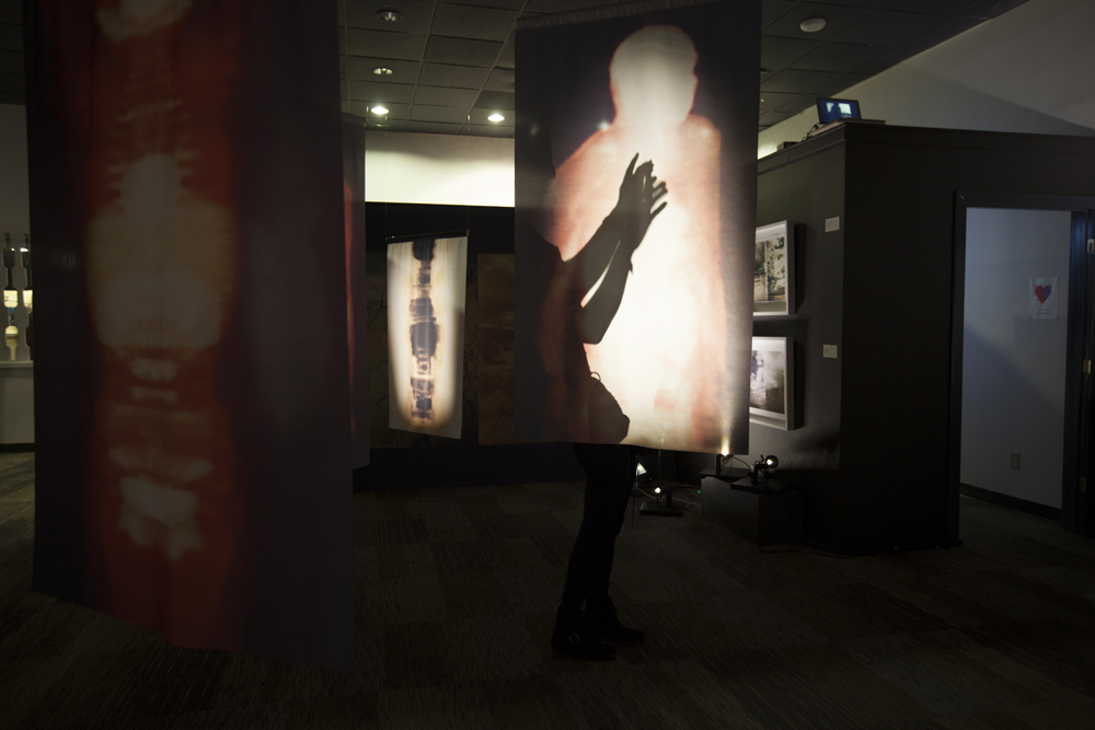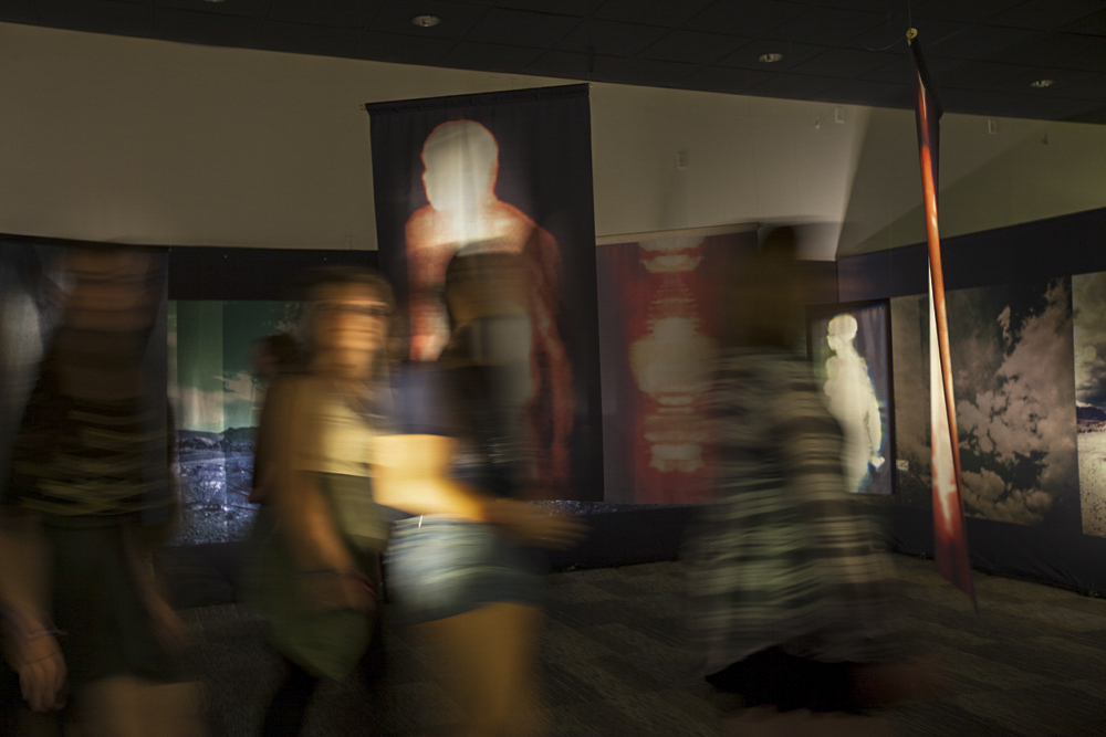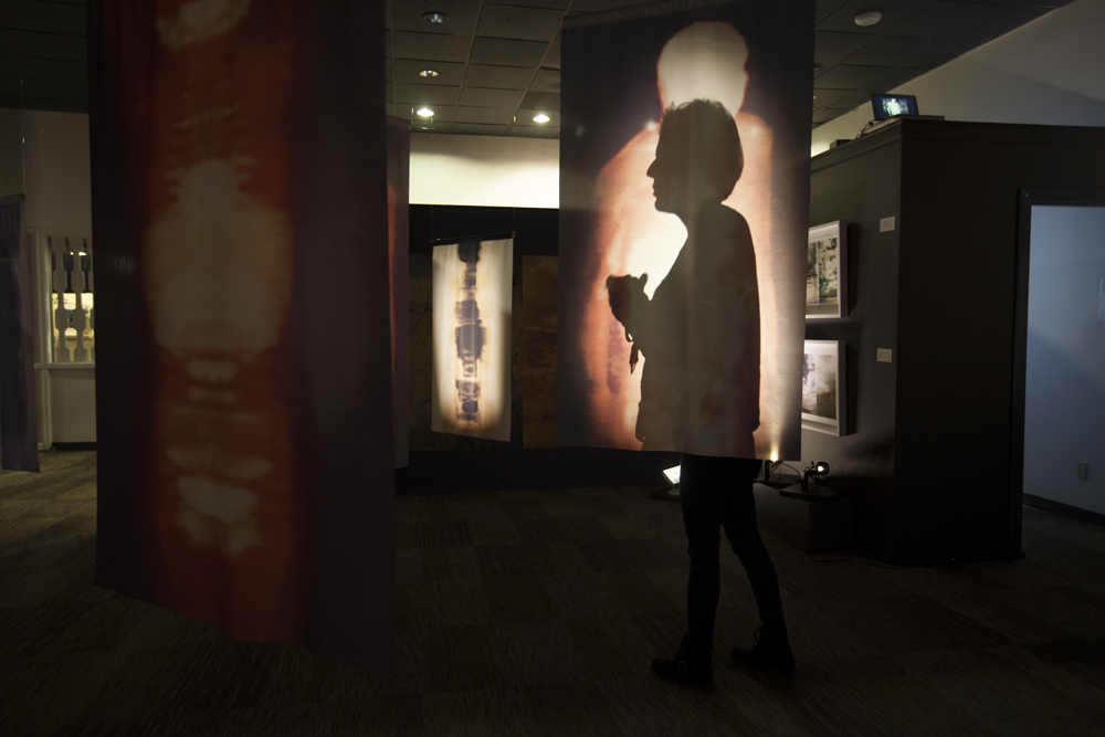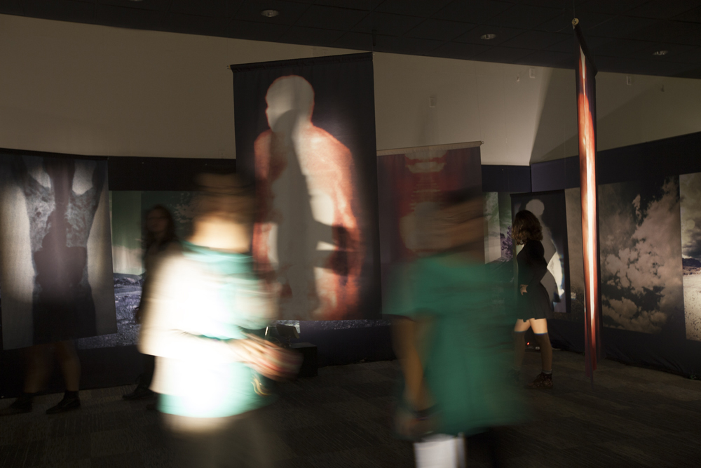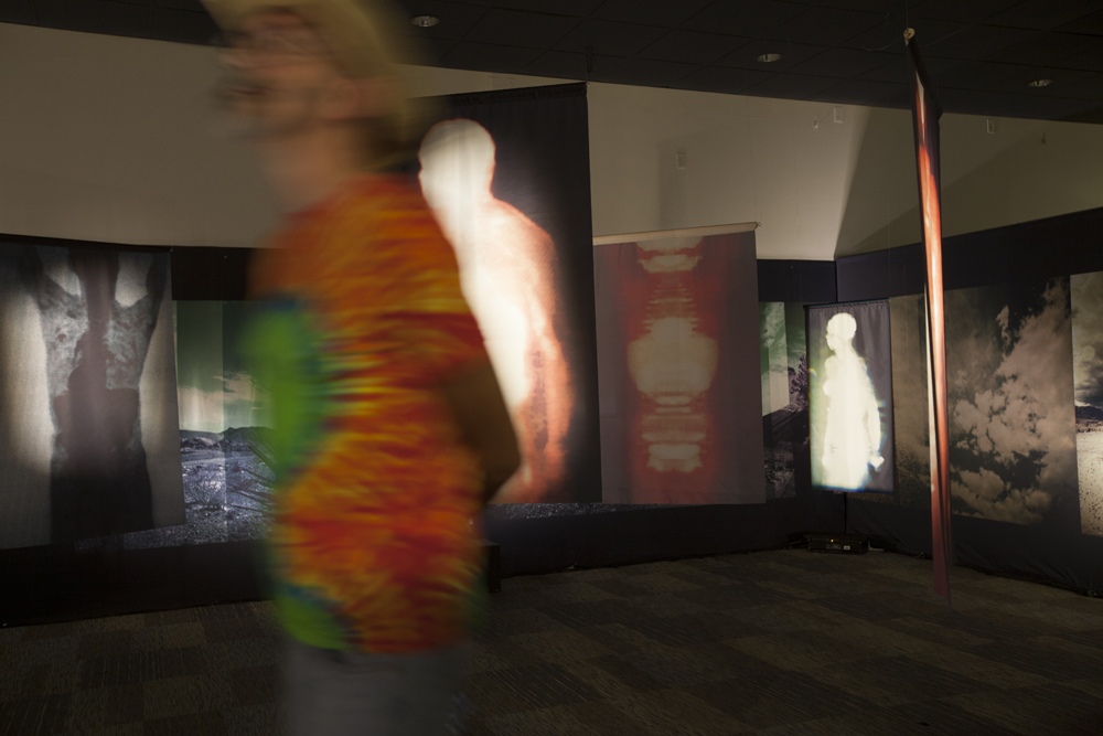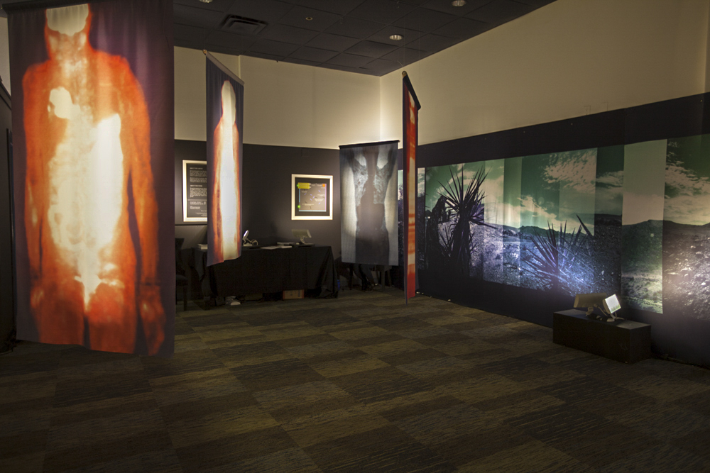 The installation is comprised of large-scale hanging images printed on transparent cloth and viewed within panoramic landscape of the Mojave Desert. As the viewer moves within the square labyrinth of shadows and light, data-driven imagery derived from medical diagnostic technology blends with photographs reflecting places of sanctuary, allowing the viewer to become an integral part of this delicate search for balance.